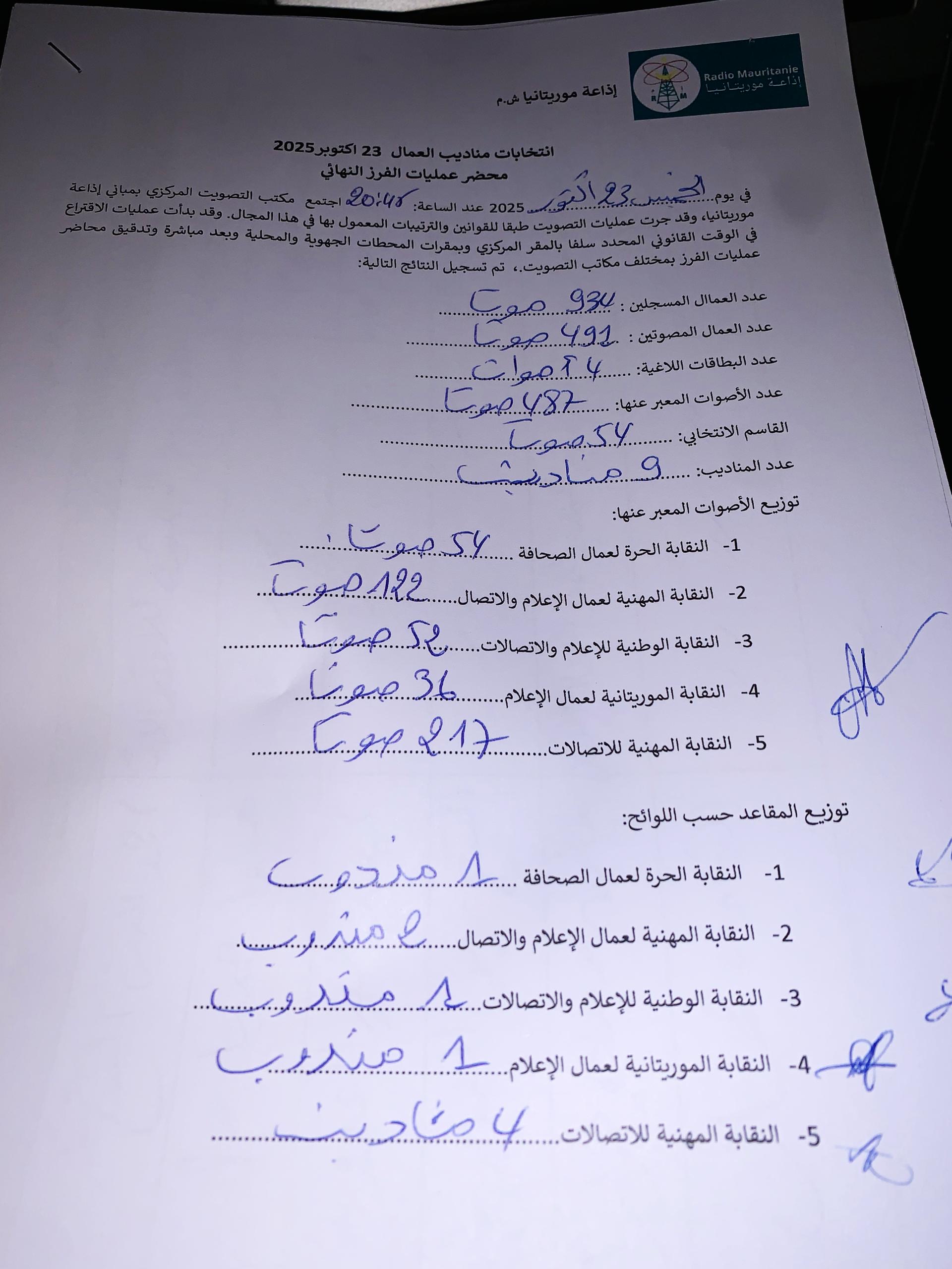 وحصلت النقابة الوطنية للإعلام والاتصال - وفق المحضر - على 52 صوتا، مقابل 36 للنقابة الموريتانية لعمال الإعلام.