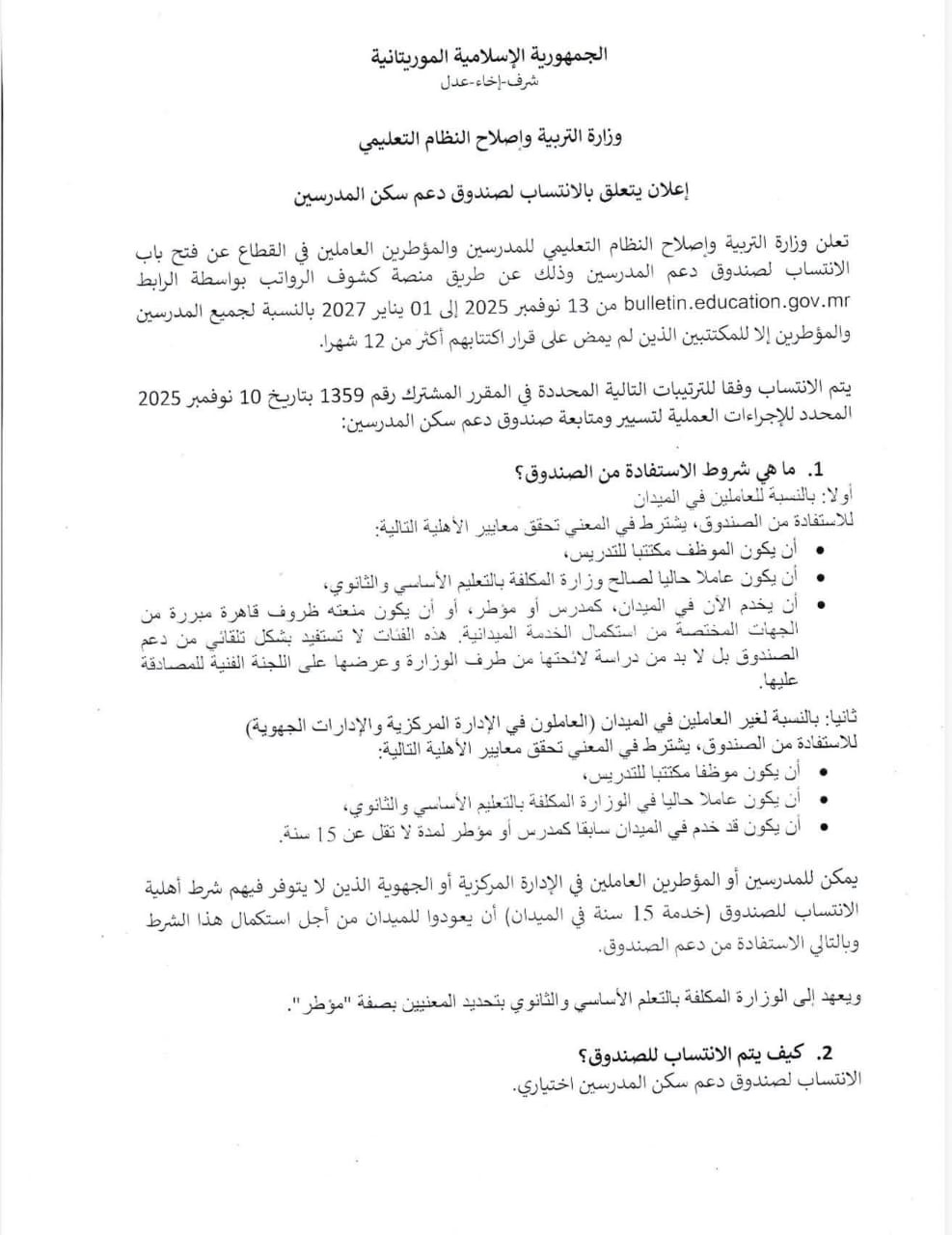 أعلنت وزارة التربية وإصلاح النظام التعليمي عن فتح باب الانتساب لصندوق دعم سكن المدرسين والمؤطرين العاملين في القطاع.