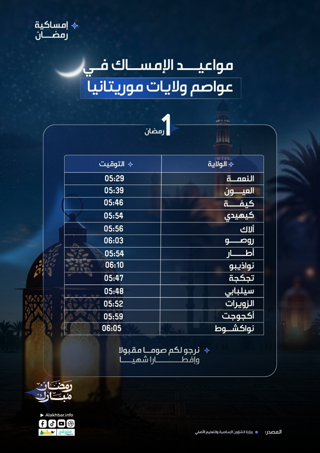 وهذه أوقات الإمساك في عواصم ولايات موريتانيا في اليوم الأول من شهر رمضان المبارك 1447 هـ.