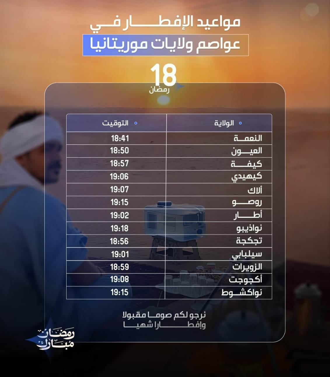 وهذه أوقات الإفطار في عواصم ولايات موريتانيا بالنسبة لليوم الـ18من شهر رمضان 1447 ه.
