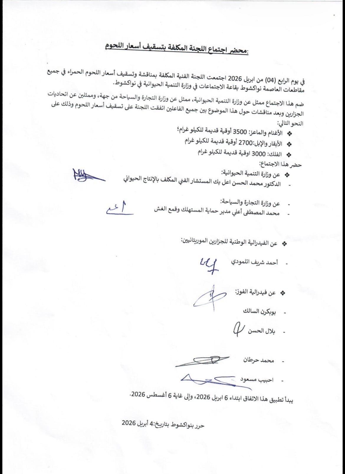 أعلنت وزارة التنمية الحيوانية اليوم السبت تحديد أسعار اللحوم الحمراء بالعاصمة نواكشوط عند 3500 أوقية قديمة لكيلوغرام لحم الضأن والماعز.