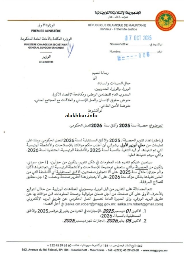 أمر الوزير الأمين العام للحكومة مختار حسينو لام أعضاء الحكومة ومن في رتبتهم بإعداد حصيلة بالإصلاحات والإنجازات التي قامت بها قطاعاتهم الحكومية خلال سنة 2025، وكذا آفاق عملهم للعام 2026.