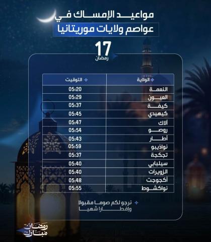 تتراوح أوقات إمساك يوم السبت السابع عشر من شهر رمضان 1447 في عواصم الولايات الموريتانية ما بين 05:20 دقيقة في مدينة النعمة عاصمة ولاية الحوض الشرقي، و05:59 دقيقة في مدينة نواذيبو شمال غربي البلاد.