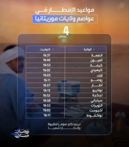 تتراوح أوقات الإفطار اليوم الأحد رابع أيام شهر رمضان المبارك 1447 هجرية، في عواصم الولايات الموريتانية ما بين 18:37 دقيقة في مدينة النعمة عاصمة ولاية الحوض الشرقي، و19:13 دقيقة في مدينة نواذيبو عاصمة البلاد الاقتصادية.<