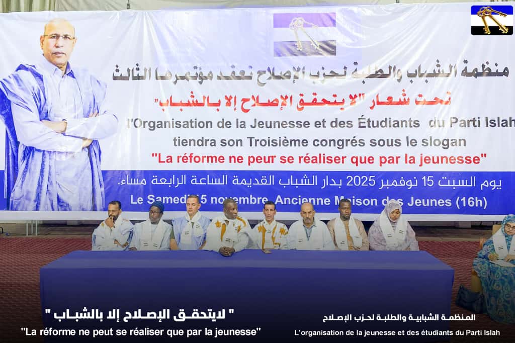 عقدت مساء السبت 15 نوفمبر 2025 منظمة الشباب والطلبة لحزب الإصلاح مؤتمرها الثالث تحت عنوان ( لايتحقق الإصلاح إلا بالشباب ) وقد حضر حفل افتتاح المنظمة بعض قيادات الحزب من بينهم رئيسه النائب الأستاذ محمد ولد طالبن وأمينته العامة الوز